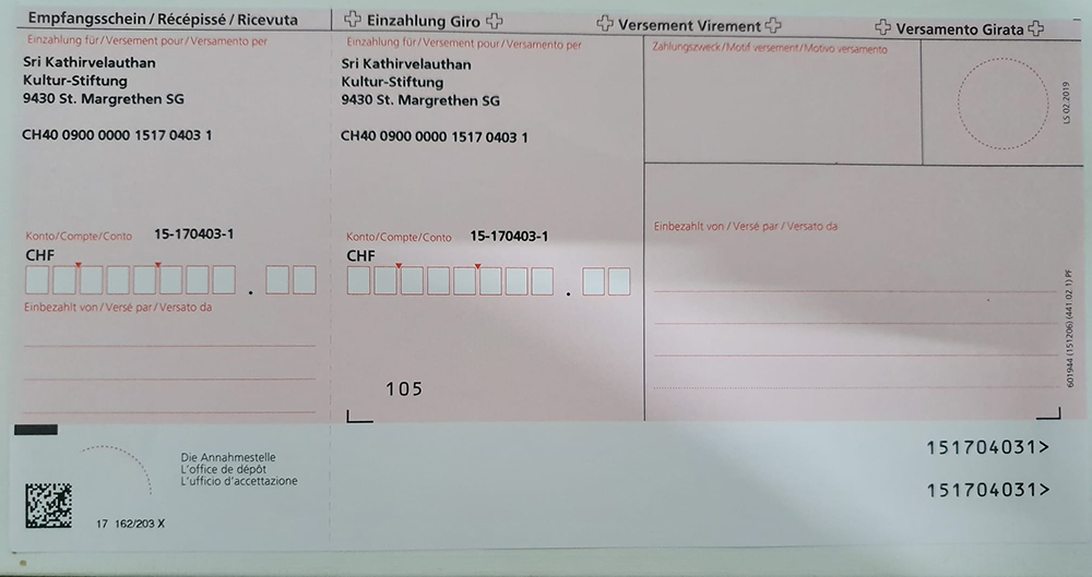 சுவிற்சர்லாந்து அருள்மிகு ஸ்ரீ கதிர்வேலாயுத சுவாமி ஆலயத்திற்கு உங்களால் இயன்ற  நன்கொடையை  வழங்கி ஆலய வளர்ச்சிக்கு  உங்களுடைய பங்களிப்பை செலுத்த ஆர்வம்   உள்ளவர்கள் ஆலயத்தின் நிர்வாகத்தை  தொடர்பு கொள்ளும்படி  valkaiமையுடன்  கேட்டுக்கொள்கின்றனர்.