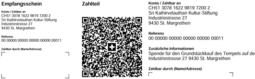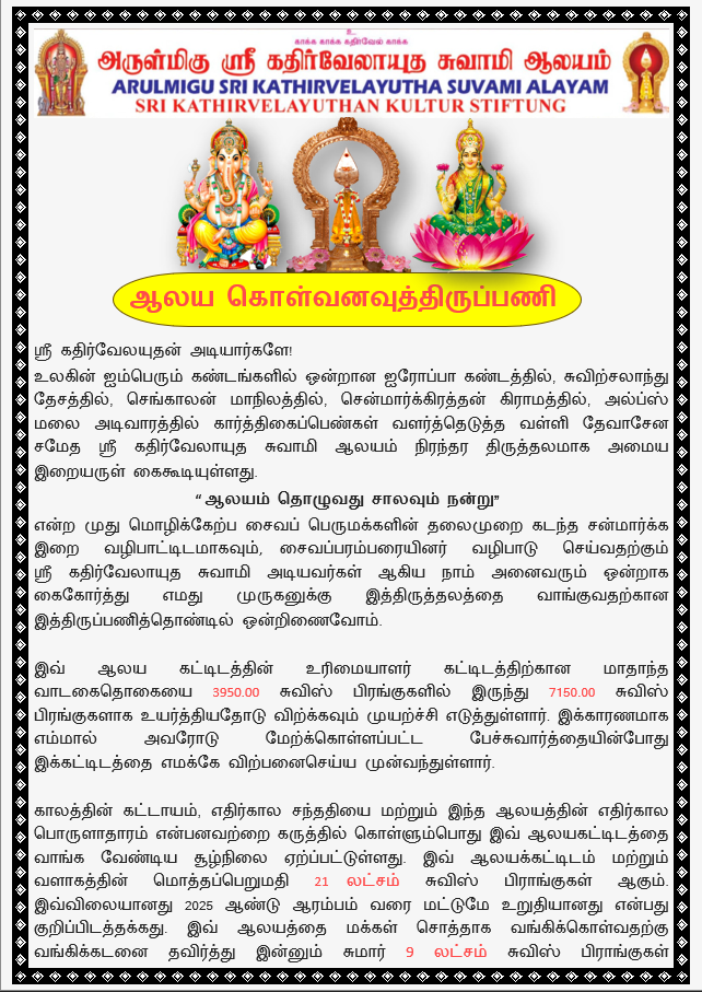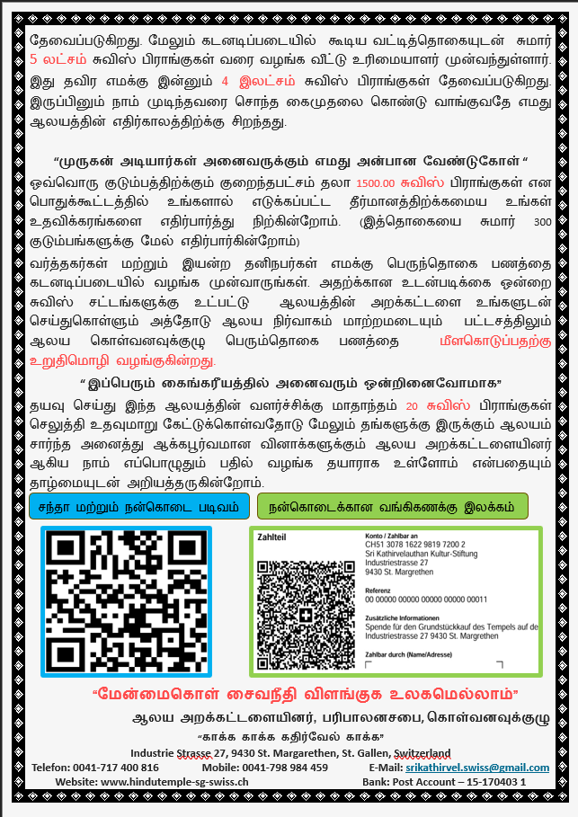 தயவு செய்து இந்த ஆலயத்தின் வளர்ச்சிக்கு மாதாந்தம் 20 சுவிஸ் பிராங்குகள் செலுத்தி உதவுமாறு கேட்டுக்கொள்வதோடு மேலும் தங்களுக்கு இருக்கும் ஆலயம் சார்ந்த அனைத்து ஆக்கபூர்வமான வினாக்களுக்கும் ஆலய அறக்கட்டளையினர் ஆகிய நாம் எப்பொழுதும் பதில் வழங்க தயாராக உள்ளோம் என்பதையும் தாழ்மையுடன் அறியத்தருகின்றோம்.